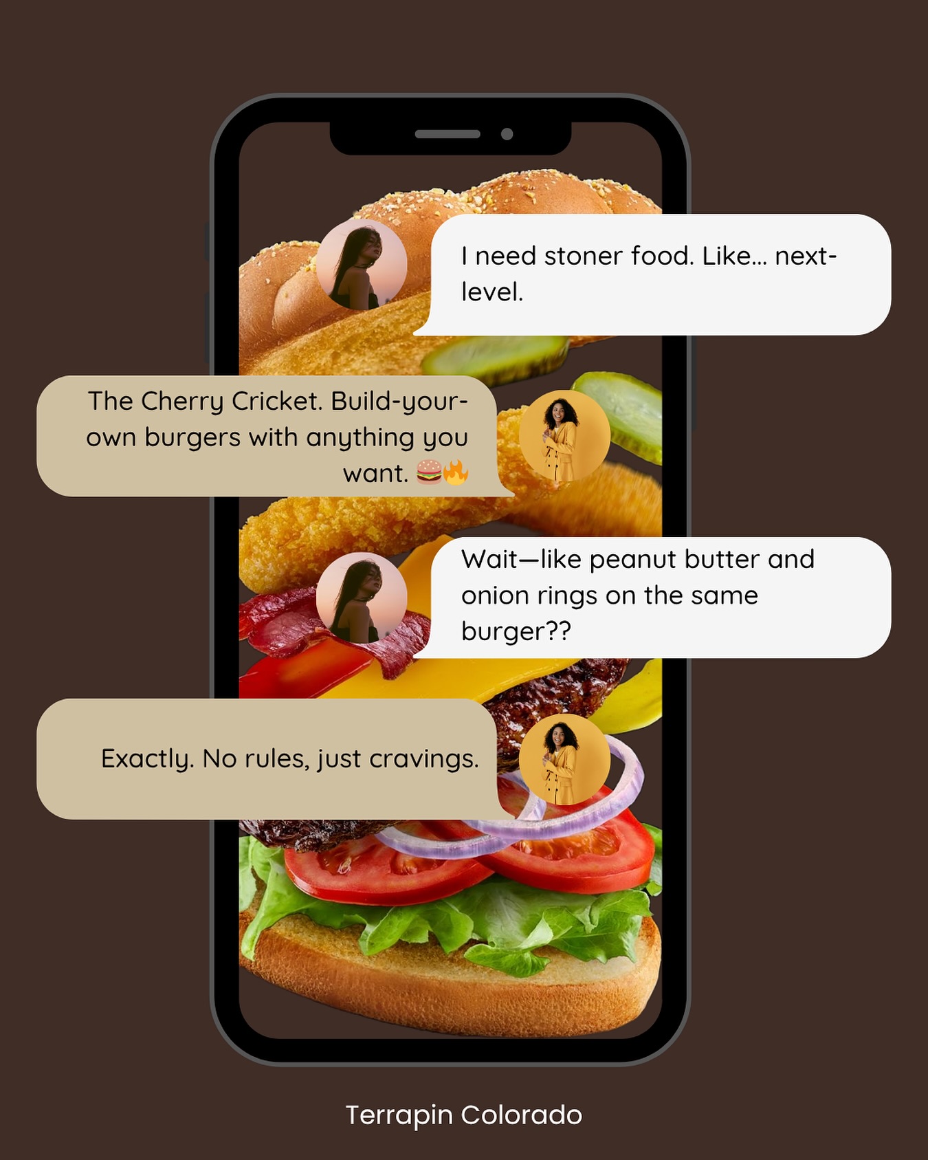 Burgers built for herb-fueled Frankenstein customization. From peanut butter to onion rings (yep, on the burger), this is where your high ideas become high cuisine. Pull up stoned, stack it weird, and thank us later. Tag your burger-building buddy #MunchieMission #CherryCricketCravings #WeedEats #FrankensteinBurger #MileHighMunchies #TerrapinColorado