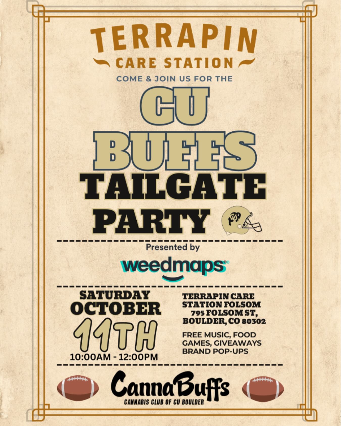 We had such a blast we decided to run it back! Join us, @wdmaps and @cannabuffs on October 11th at our Folsom location for our next pre-game tailgate 𦬠Show your Buffs spirit and pick up some exclusive swag and goodies! Weāll be partying and bumping tunes from 10 AM – 12 PM š SKO BUFFS and see you next weekend! @terrapinstorescolorado #SKOBUFFS #CollegeFootball #BoulderCO #FlowerToThePeople #FolsomField #CUBoulder #CannabisColorado #FlatIrons #Tailgate #LiveMusic